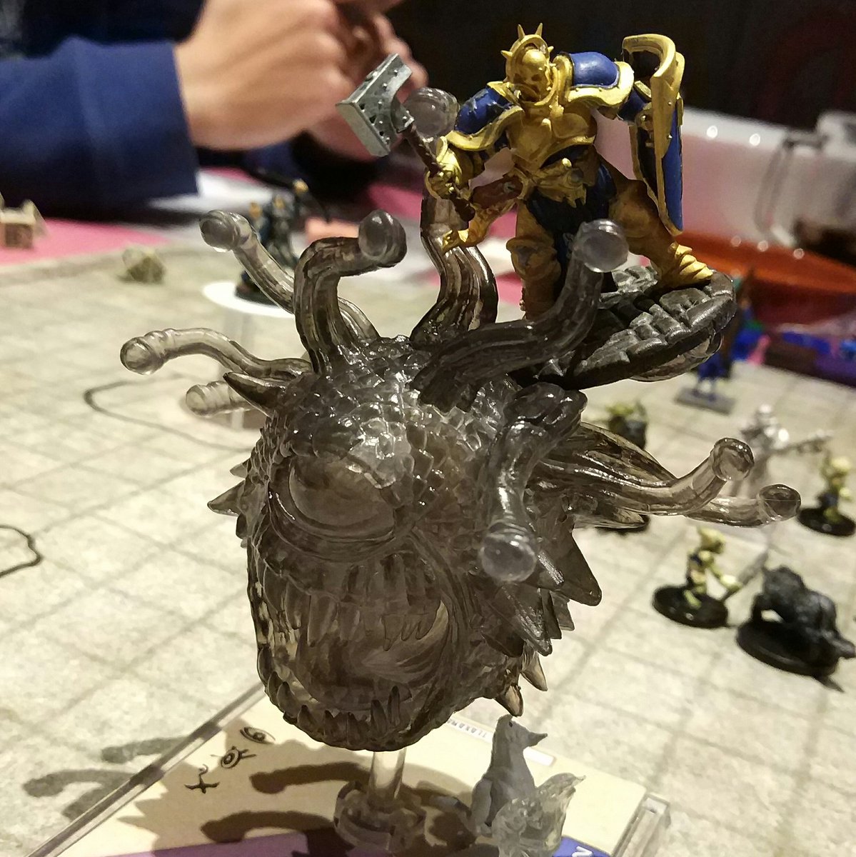 Todos están en el suelo, Debra tiene perros encima de ella, Marvin está petrificado, Englier ha conseguido subirse encima del Beholder y ha conseguido aguantar el ataque de 8 de sus ojos 👀, sabe que puede que ese sea su último ataque, y la última esperanza de sus compañeros, así que jugándose el todo por todo, golpea al beholder atravesándolo con la maza mientras gritaba “por Torag!!!!”