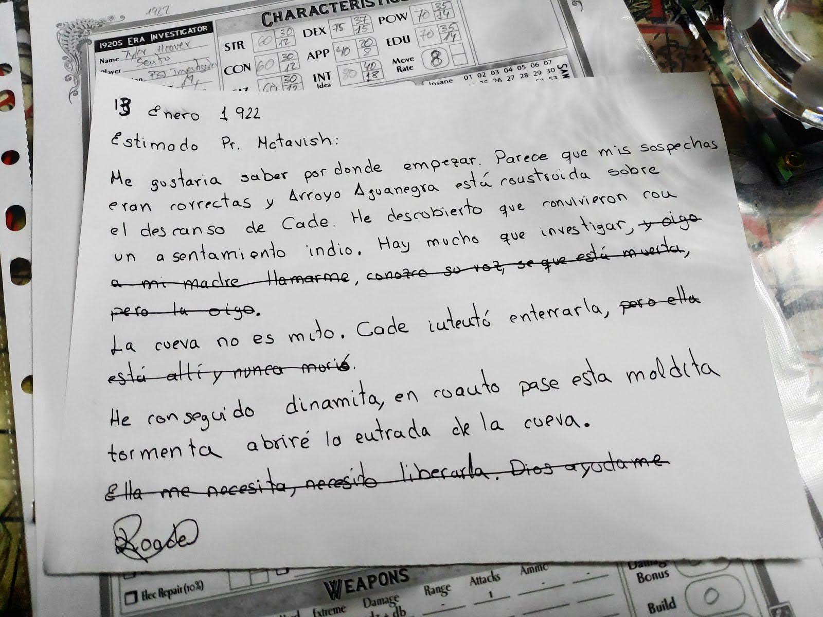 Por otro lado Mathew se reunió con McTavis. Al llegar le entregó una carta del Dr. Roades, un amigo y compañero de la universidad, que semanas atrás viajó con su mujer y un grupo de estudiantes al Arroyo de Aguasnegras. Allí, según su investigación, esperaban encontrar un asentamiento precolonial de un famoso pionero, Cade. Hace una semana volvieron los alumnos sin el profesor y sin su mujer y le entregaron en mano la famosa carta.