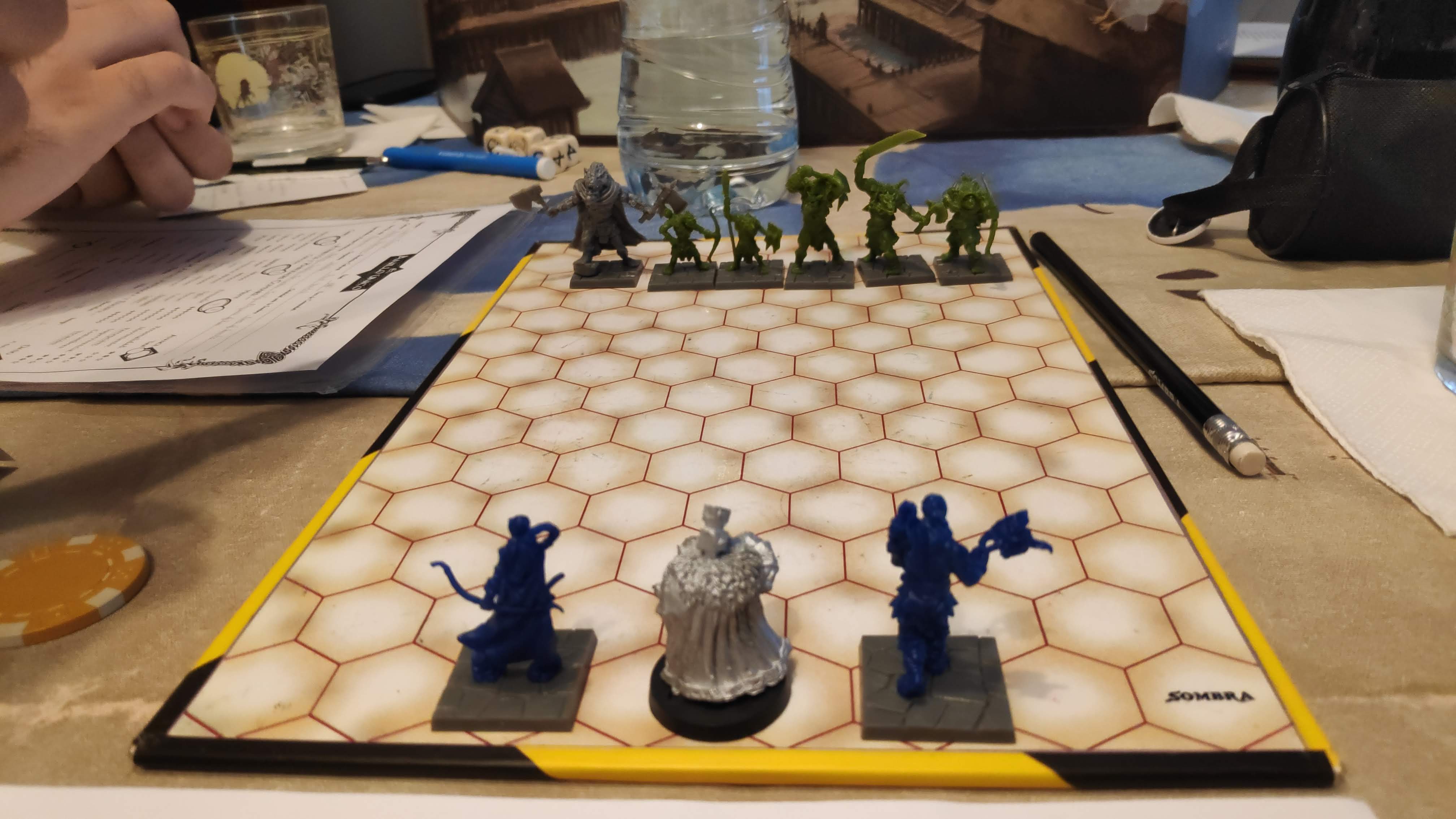 Los primeros no tuvieron suerte, se encontraron con una patrulla formada por dos trasgos y cuatro extraños orcos enormes con un ojo rojo que caminan a la luz del sol. El combate fue muy duro pero consiguieron ganarlo sin heridas de importancia, además consiguieron que dos goblins se rindieran, con idea de interrogarlos más tarde.