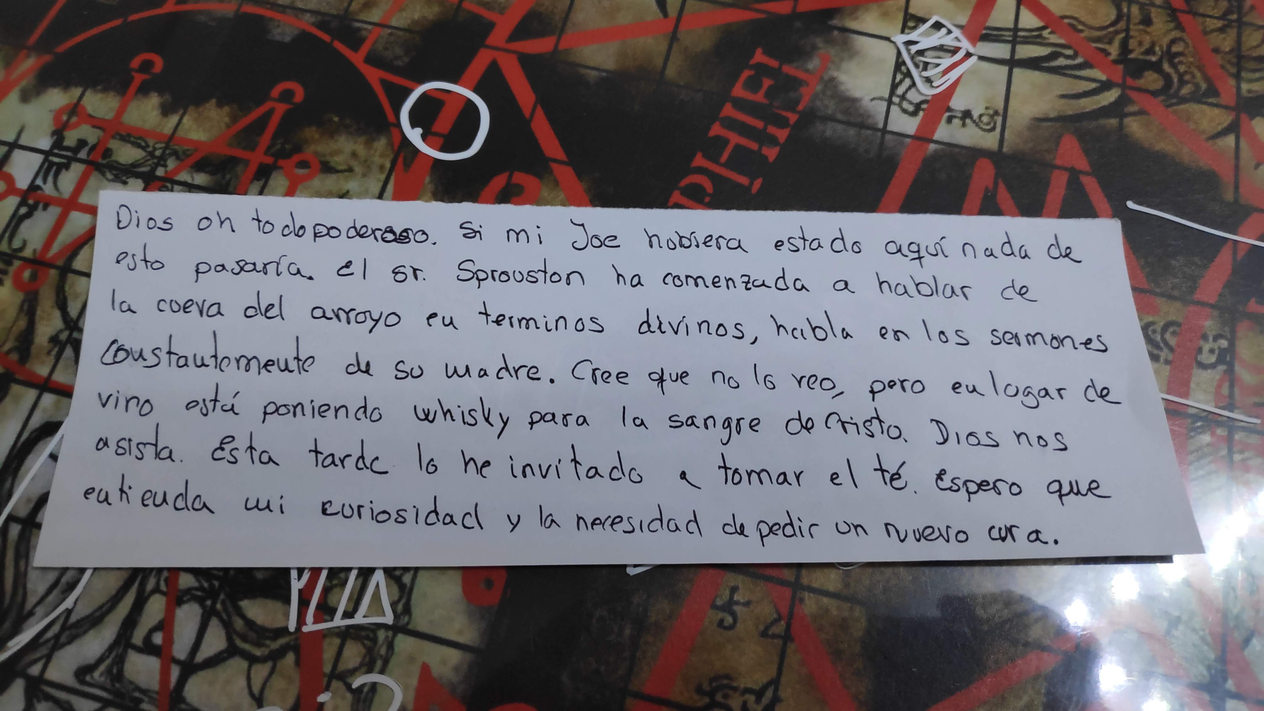 Pensamos en ir a casa de la viuda Hawkins, así que nos dirigimos a su casa con igual resultado que el día anterior, nadie respondía. Cuando tratábamos de mirar por las ventanas una tos llamó nuestra atención, se trataba de Sprowston, el reverendo / sheriff /maestro del pueblo. Nos confirmó que hacía más de dos semanas que no había visto a la viuda, pero estaba convencido de que habría ido a ver a algún familiar, pese a que no sabía si tenía alguno.