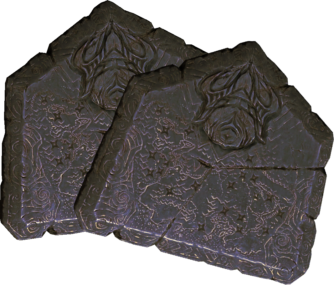| Two identical stone tablets of agate with tight, wavy lines in yellow, brown, white, and grey. On the top of each tablet there is carved a dwarven clan sign (of the Crombe clan). The observer will notice that the pattern in the stone is not solid, but shifts like a slowly rolling sea. If a finger is traced along the surface, the lines will move with it simultaneously on both tablets. |